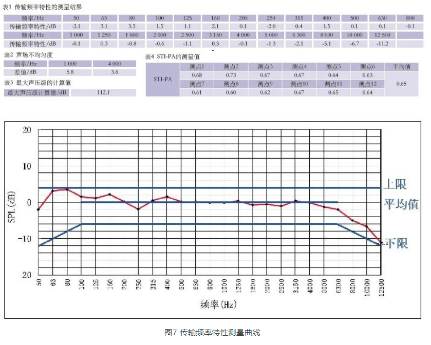 擴(kuò)聲系統(tǒng)安裝調(diào)試完畢后,筆者對(duì)主會(huì)場進(jìn)行了擴(kuò)聲系統(tǒng)指標(biāo)現(xiàn)場測試。由于主席臺(tái)區(qū)域會(huì)議發(fā)言位置未確定,此次測量并未包含傳聲增益指標(biāo),測量結(jié)果見表1至表4、圖7。擴(kuò)聲系統(tǒng)各項(xiàng)指標(biāo)均達(dá)到設(shè)計(jì)目標(biāo)及行業(yè)相關(guān)標(biāo)準(zhǔn)指標(biāo)。