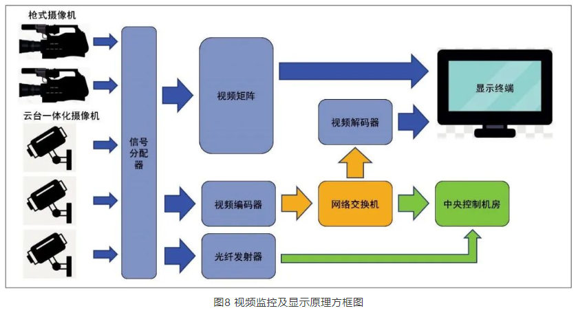 視頻監(jiān)控系統(tǒng)框架如圖8所示,視頻采集信號(hào)通過本地H D M I分配器,一路送至音視頻控制室視頻矩陣,另一路送至分布式視頻信號(hào)接收器,接入會(huì)議中心分布式視頻網(wǎng)絡(luò)。送至音視頻控制室的視頻信號(hào),送至本地控制室監(jiān)視器、同傳間監(jiān)視器、舞臺(tái)機(jī)械控制室監(jiān)視器、本地會(huì)場墻面綜合插座箱等。送至分布式視頻信號(hào)接收機(jī)的視頻信號(hào),通過會(huì)議中心音視頻網(wǎng)絡(luò)送至中央控制機(jī)房,并保留本地視頻信號(hào)光纖鏈路,可通過光收發(fā)設(shè)備直傳至中央控制機(jī)房。