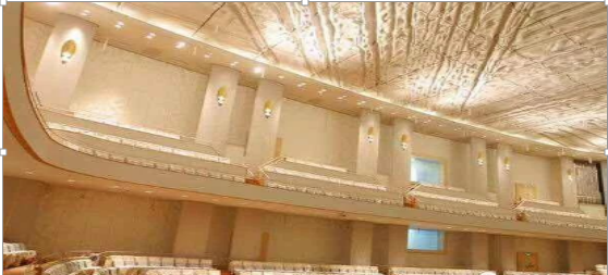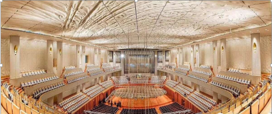音樂廳的天花板形狀不規則的白色浮雕像一片起伏的沙丘。天花板上看似凌亂的溝槽實際上經過了特別的聲學設計,使聲音能夠被擴散反射,更加均勻、柔和。精美的天花板其實是特制的聲擴散裝飾板。天花板使用纖維石膏成型板制成,材質厚重,能夠有效地防止低頻吸收,增強廳內的低頻混響時間,使低音效果(如管風琴、大管、大提琴等)更加具有震撼力和感染力。為達到聲效的完美,在頂棚的下面還懸掛了一面龜背形狀的集中式反聲板,俗稱“龜背反聲板”,它的作用是將聲音向四面八方散射。