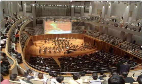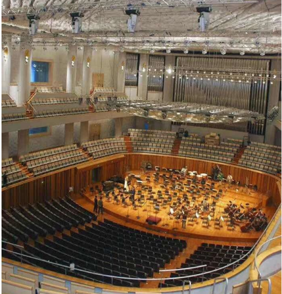 音樂廳舞臺四周的墻面采用了與戲劇場類似的聲學擴散墻,墻面有如站立起來的鋼琴琴鍵,凸凹起伏、不規則排列。其凹凸的尺寸和形狀經由數論精確計算得出,能擴散反射來自演奏臺的聲音,保障演出者良好的自我聽聞和相互聽聞,有利于樂隊更好地發揮表演水平。音樂廳的側墻則采用與天花板類似的聲擴散裝飾板,墻壁表面輕微凹凸的效果同樣經過特殊設計。通過這些凹凸不平的紋理,能將聲音均勻地擴散反射至音樂廳空間內的每個角落。在這些量身設計的綜合作用下,音樂廳的混響時間可以達到2.2秒的優質音效。
