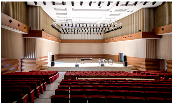 “琴島”音樂廳建筑面積2100平方米,內部結構呈扇形狀,扇形音樂廳的天頂呈等勢的遞進,目的是令聲學能量均勻擴散。在這種音樂廳中,聲樂的直接信號更容易送達。