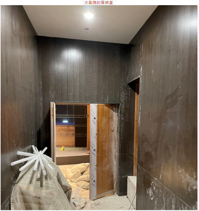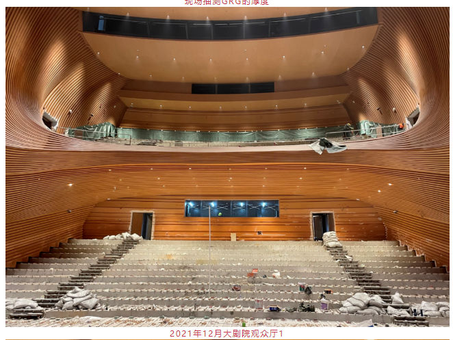 大劇院內部的施工進度很快,短短的5個月,完成了從“鋼筋森林”到“精致劇院”的華麗轉變。大劇院內部經過聲學計算和模擬,側墻均采用硬質擴散造型,保證場內的音質環(huán)境,后墻采用成品MLS擴散體,全場流線型的造型連貫、大氣。造型的角度、造型的尺度以及造型的面密度都嚴格按照聲學控制來落地。