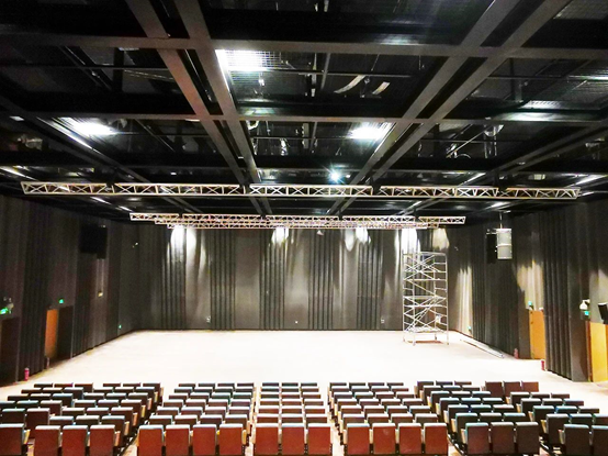 音樂廳設兩層觀眾席。綜合功能需求和場地大小,使用左右主擴的配置方式。主擴聲系統安裝在舞臺兩側上空,負責一層池座以及二層樓座的所有觀眾席覆蓋。得益于VUE音響小尺寸大聲壓的技術特點,一二層觀眾席在沒有補聲情況下,只靠兩組線陣列覆蓋也可以讓音樂廳的擴聲系統聲學特性指標達到國標文藝演出類一級標準。