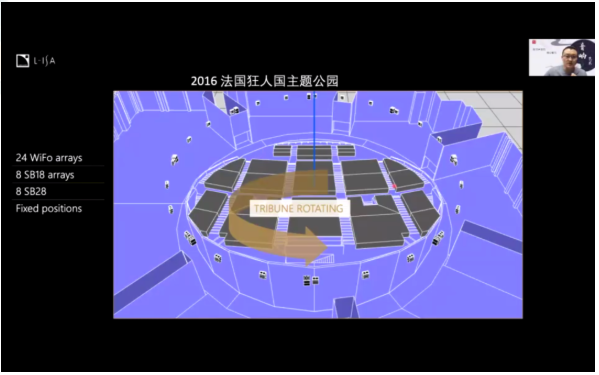 這個智能化的追蹤平臺叫做Black Trax,是一個基于視覺來追蹤的追蹤系統(tǒng),它可以在復(fù)雜的環(huán)境中實時的追蹤表演者,或任何帶有Black Trax信標(biāo)器的任何目標(biāo),還能發(fā)送定位信息到調(diào)光臺,媒體服務(wù)器或其他的第三方系統(tǒng),實現(xiàn)各個部門的聯(lián)通。2016年的法國狂人主題公園也運(yùn)用到了這個技術(shù),整個舞美的布局十分巧妙,觀眾席中間圍繞著軸旋轉(zhuǎn),音響則是圍著周邊布置一圈,共有24組。在整個的場地和觀眾座位的旋轉(zhuǎn)以及演員行走的同時,聲音還是保持了定位。