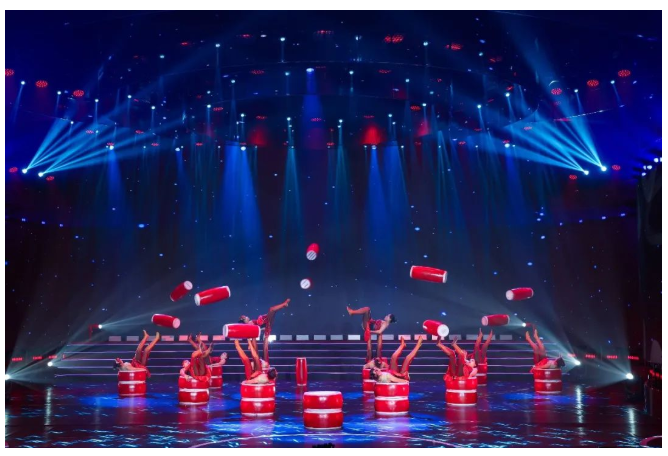 雜技《鼓與呼》通過傳統(tǒng)雜技蹬鼓表演,配合昂揚有力的鼓樂節(jié)奏,呈現(xiàn)力與美的視覺盛宴,展示昂揚向上的奮斗精神和時代風貌。